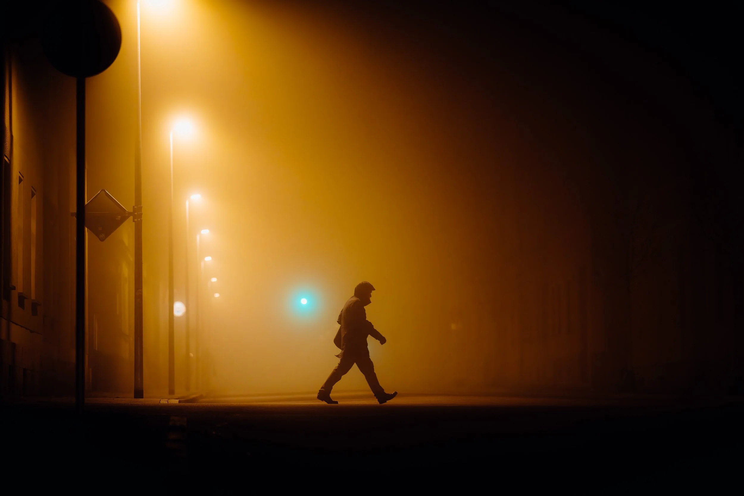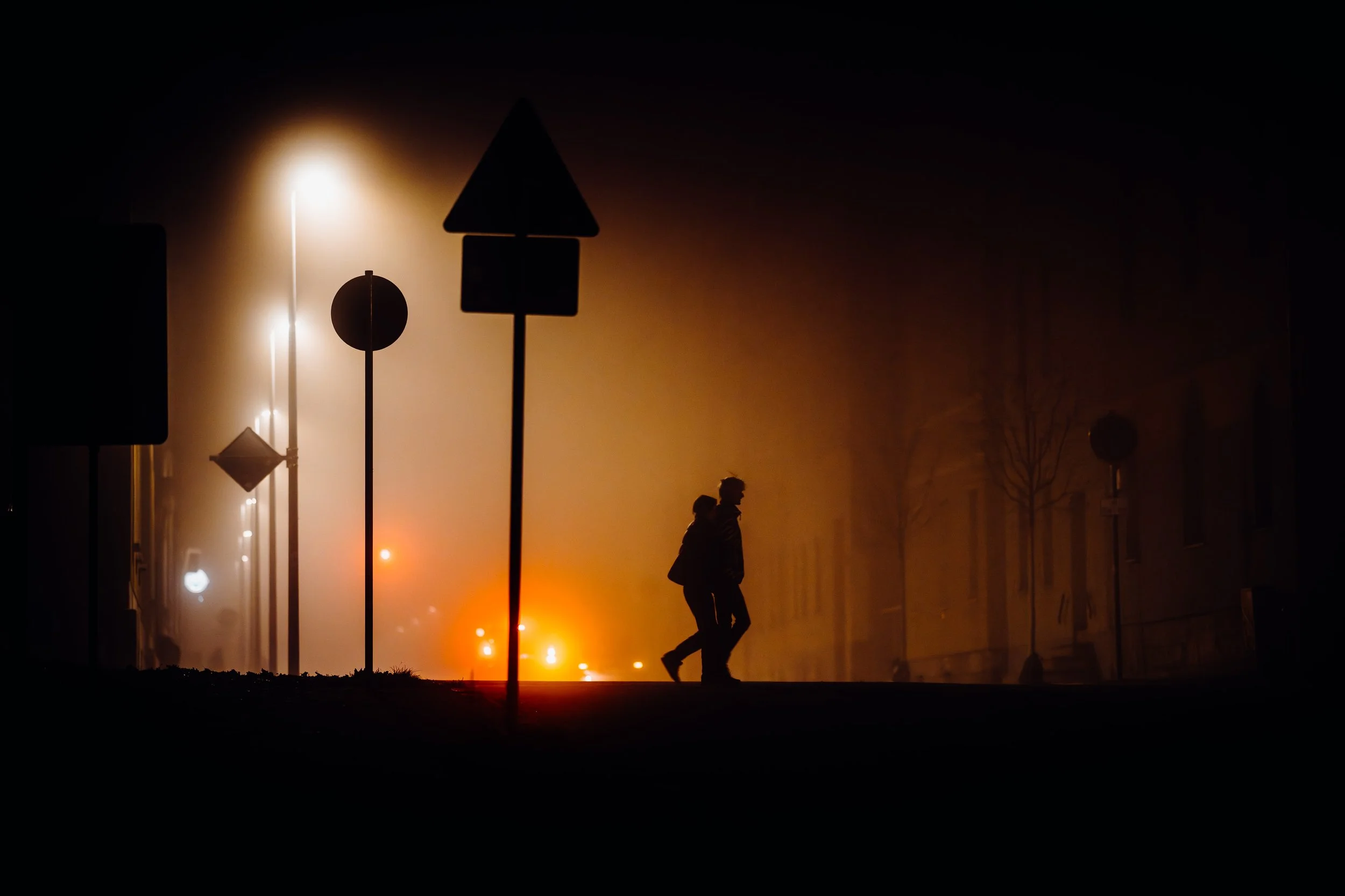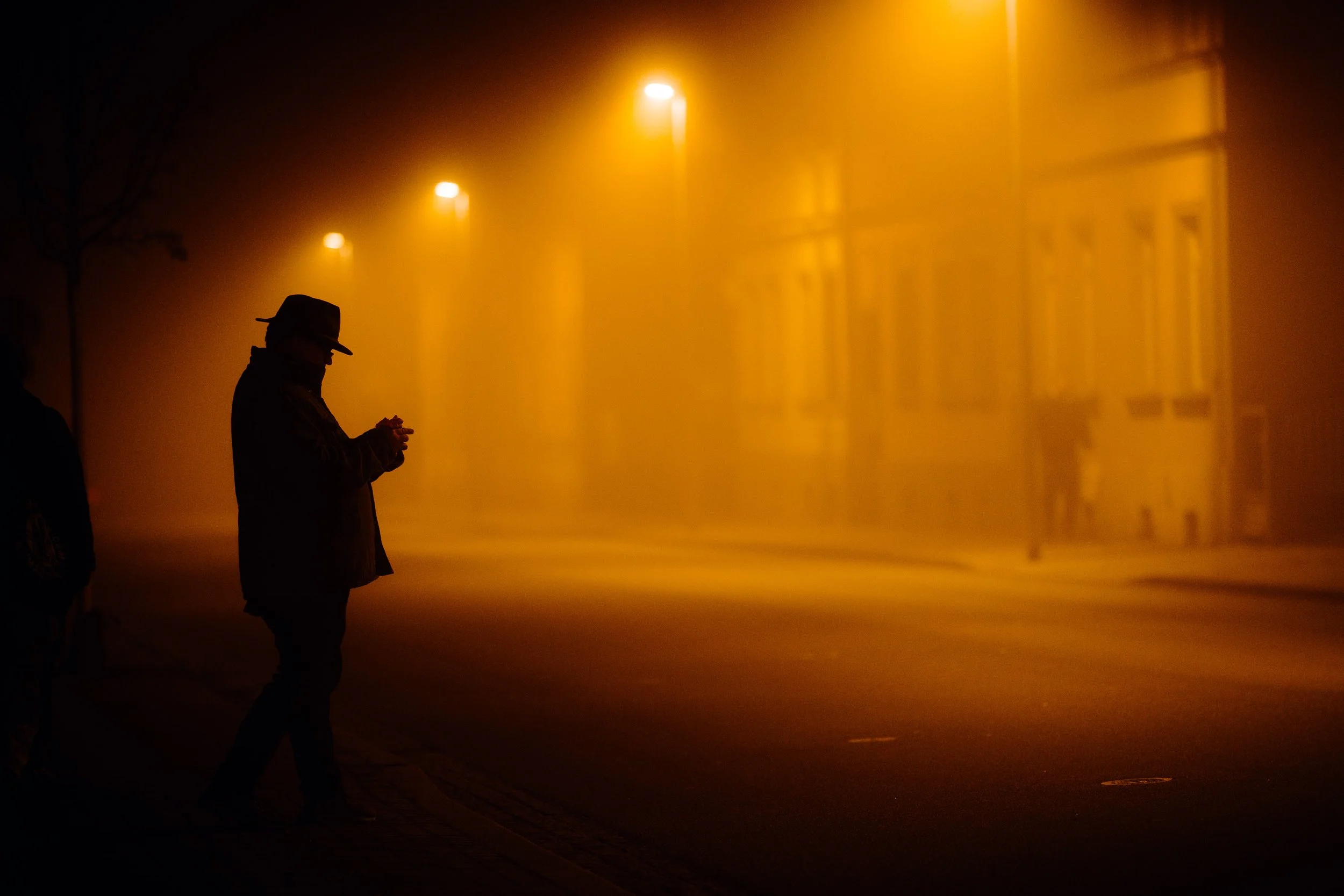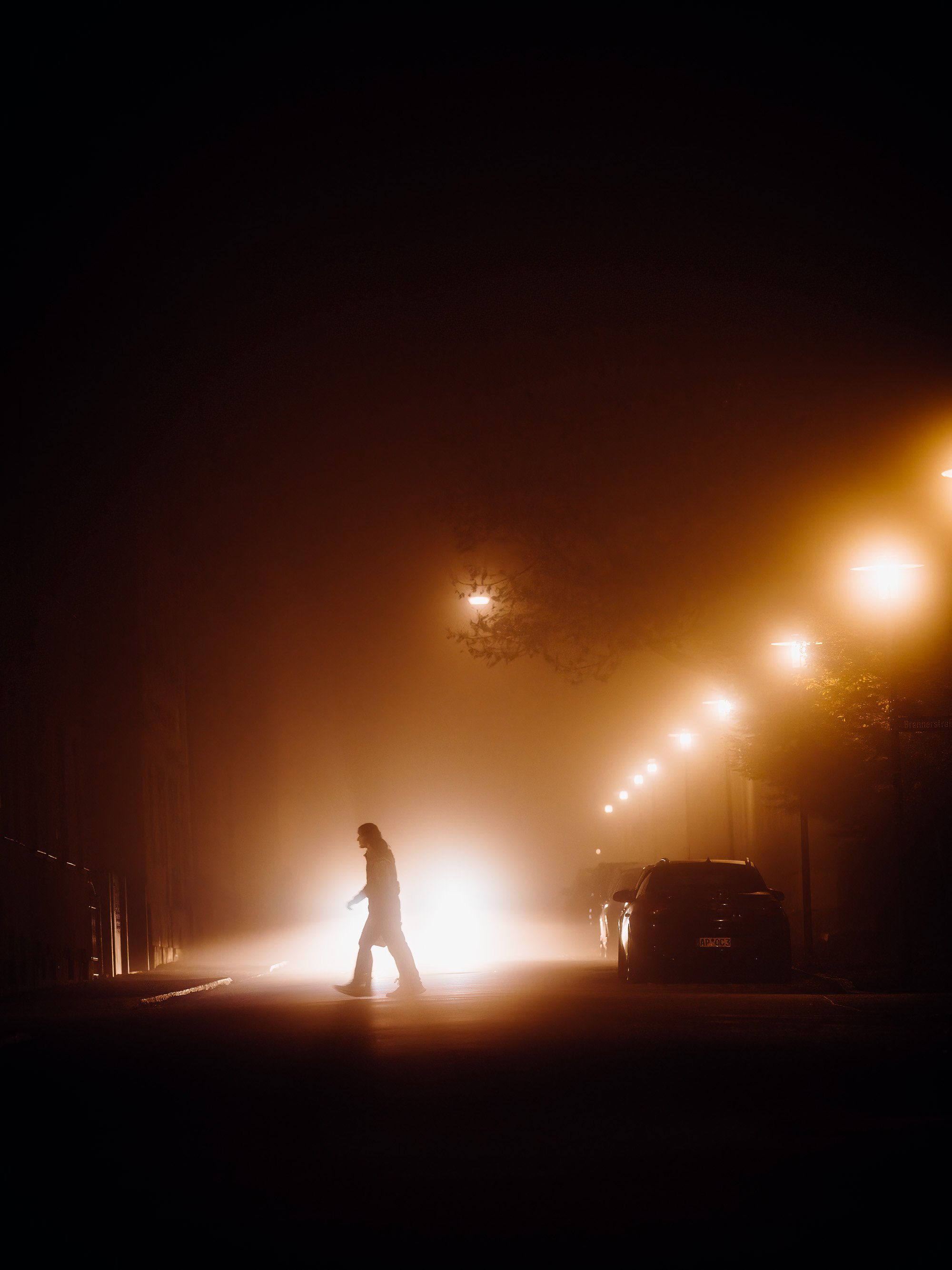 Die Autoscheinwerfer werfen lange, geisterhafte Schatten auf die leeren Straßen, die in der feuchten Luft fast greifbar erscheinen. Diese Schatten ziehen mich besonders an. Sie schaffen eine ganz eigene Szenerie: ein Spiel von Dunkelheit und Licht, von Schärfe und Unschärfe, das nur durch die Beschaffenheit des Nebels möglich wird. Die Stadt wirkt dadurch surreal – fast als ob man sie durch den Schleier eines Traums betrachten würde. Personen, die durch die Nacht eilen, wirken durch die Vergrößerung der langen Brennweite wie in einer eigenen, kleinen Welt gefangen. Ihre Silhouetten scheinen beinahe geisterhaft und schemenhaft