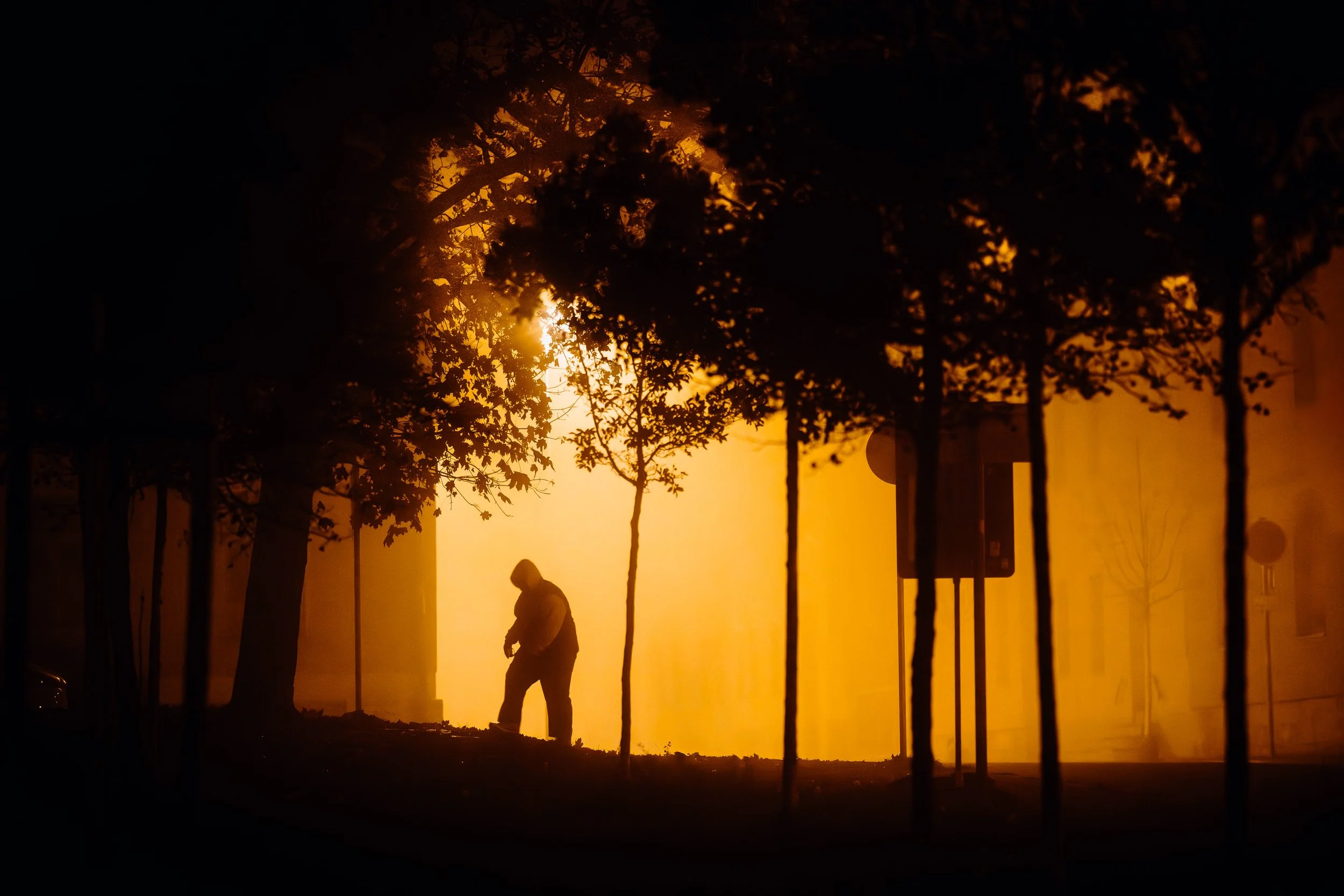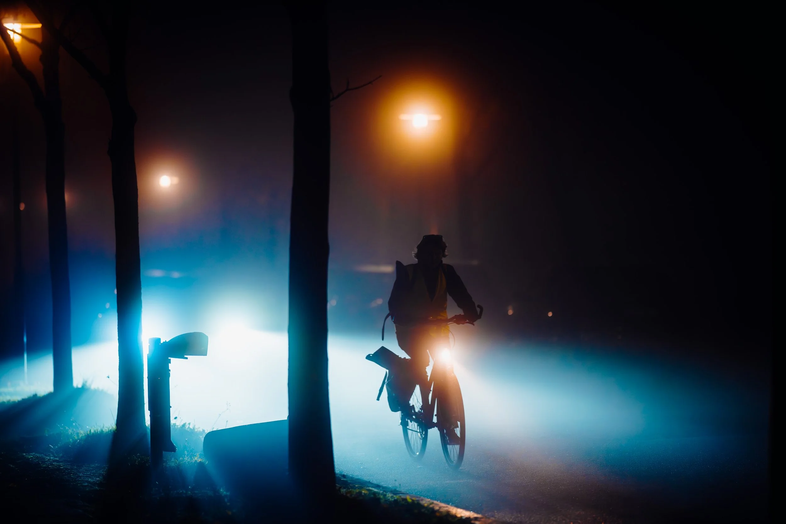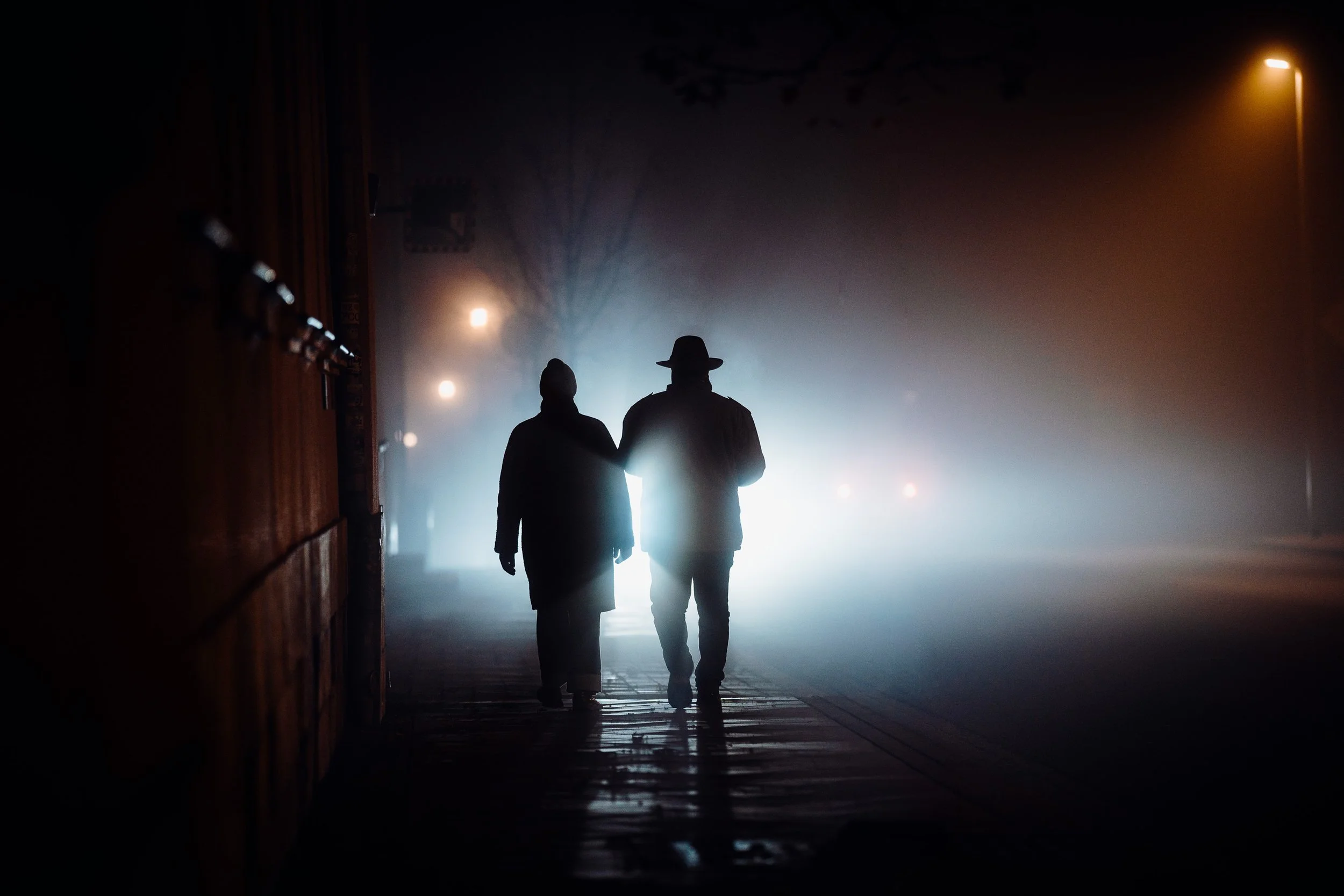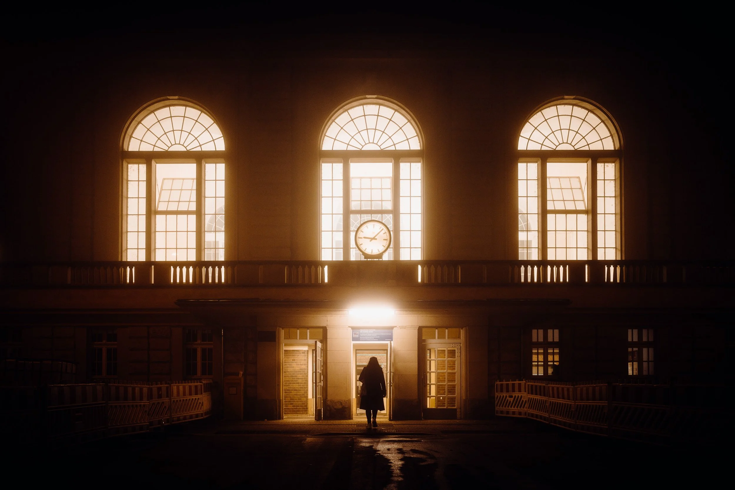 Die Autoscheinwerfer werfen lange, geisterhafte Schatten auf die leeren Straßen, die in der feuchten Luft fast greifbar erscheinen. Diese Schatten ziehen mich besonders an. Sie schaffen eine ganz eigene Szenerie: ein Spiel von Dunkelheit und Licht, von Schärfe und Unschärfe, das nur durch die Beschaffenheit des Nebels möglich wird. Die Stadt wirkt dadurch surreal – fast als ob man sie durch den Schleier eines Traums betrachten würde. Personen, die durch die Nacht eilen, wirken durch die Vergrößerung der langen Brennweite wie in einer eigenen, kleinen Welt gefangen. Ihre Silhouetten scheinen beinahe geisterhaft und schemenhaft
