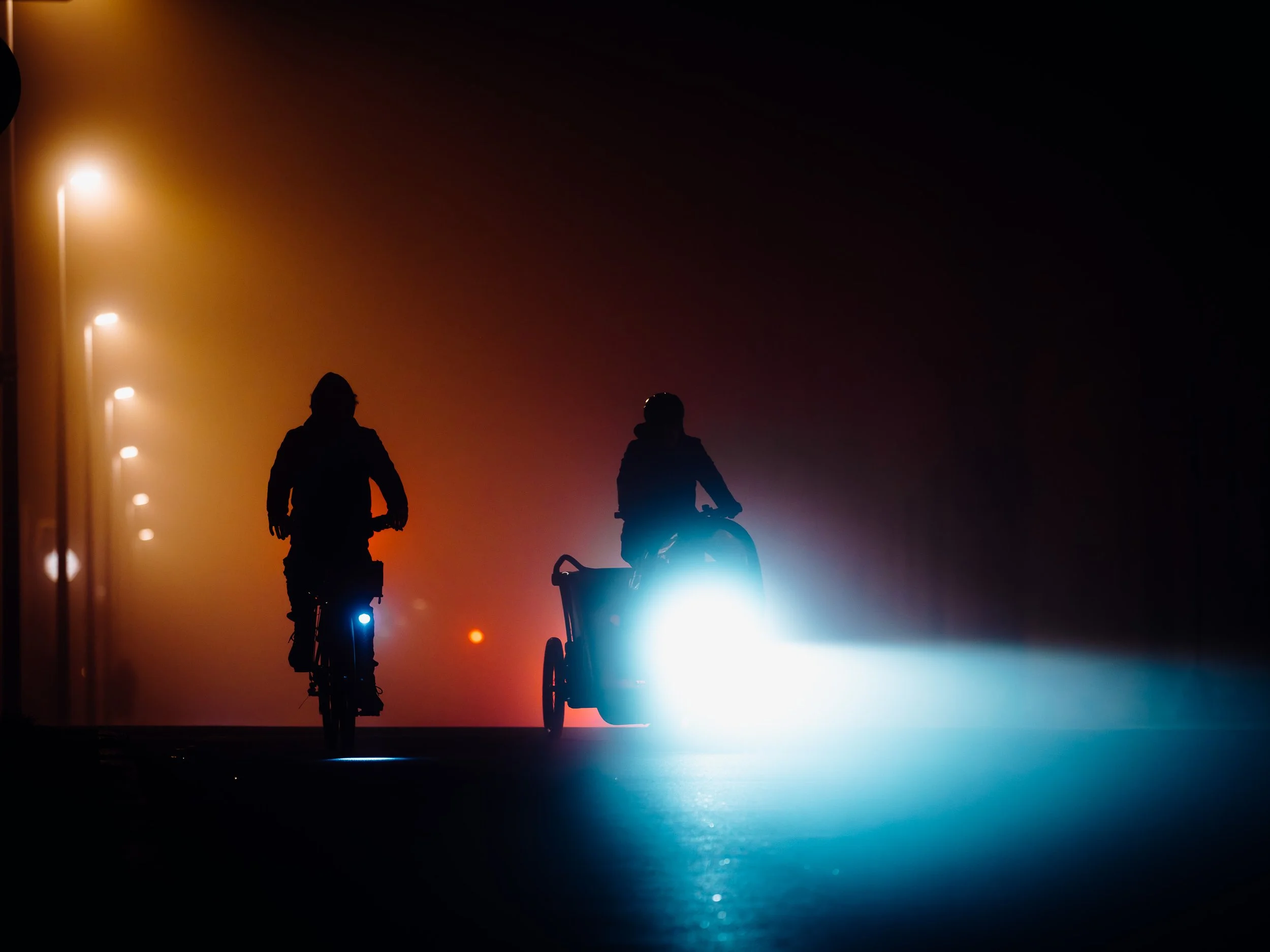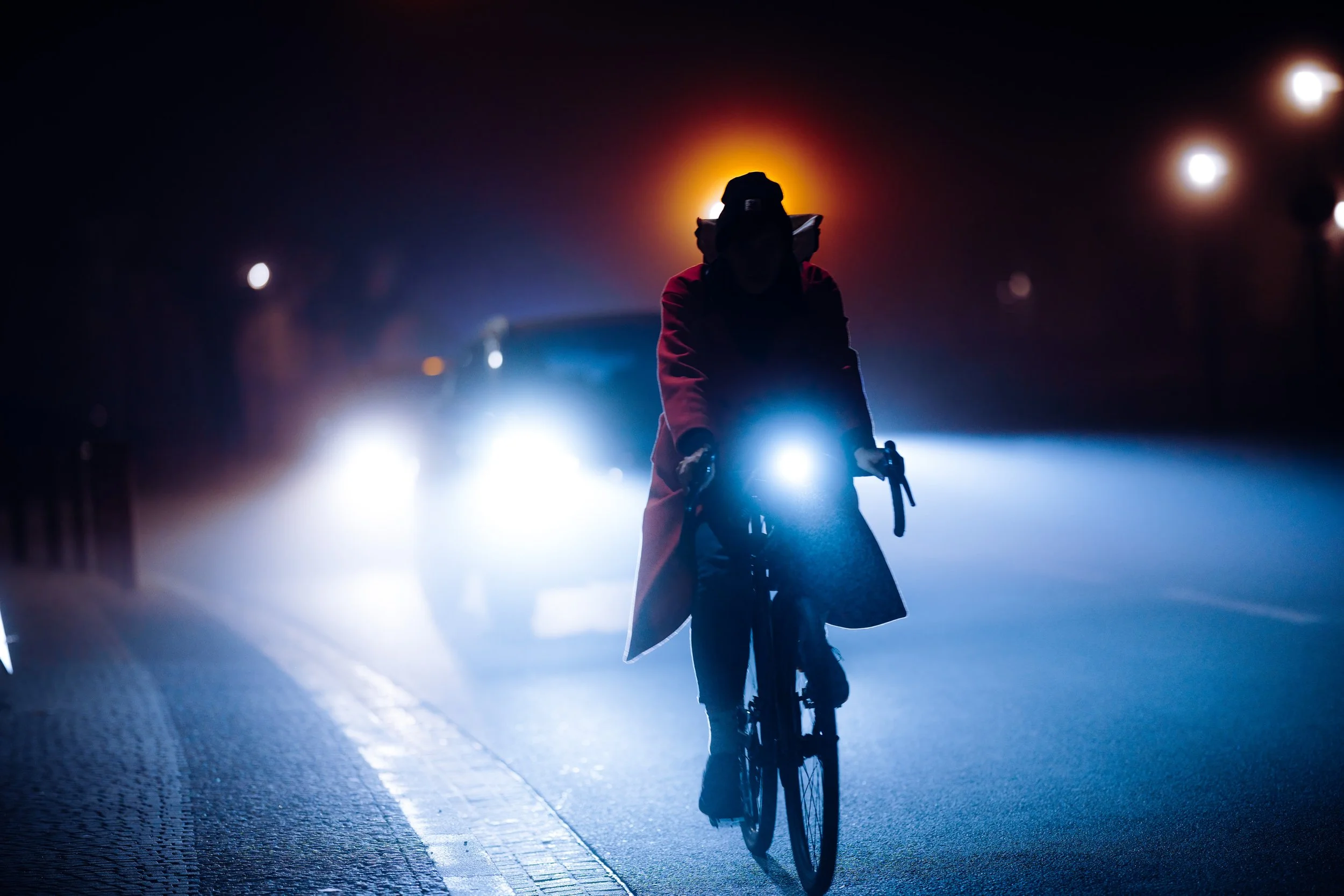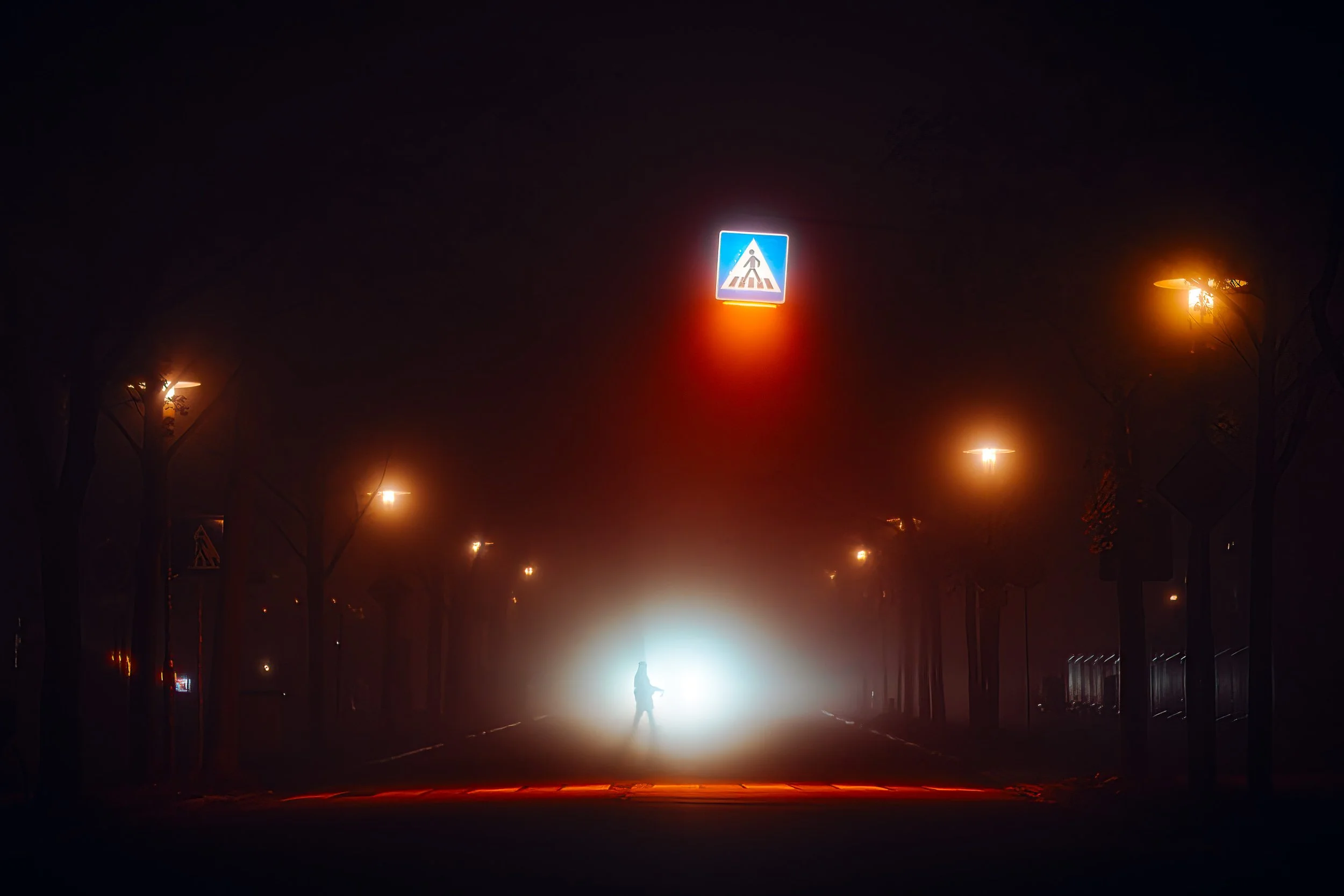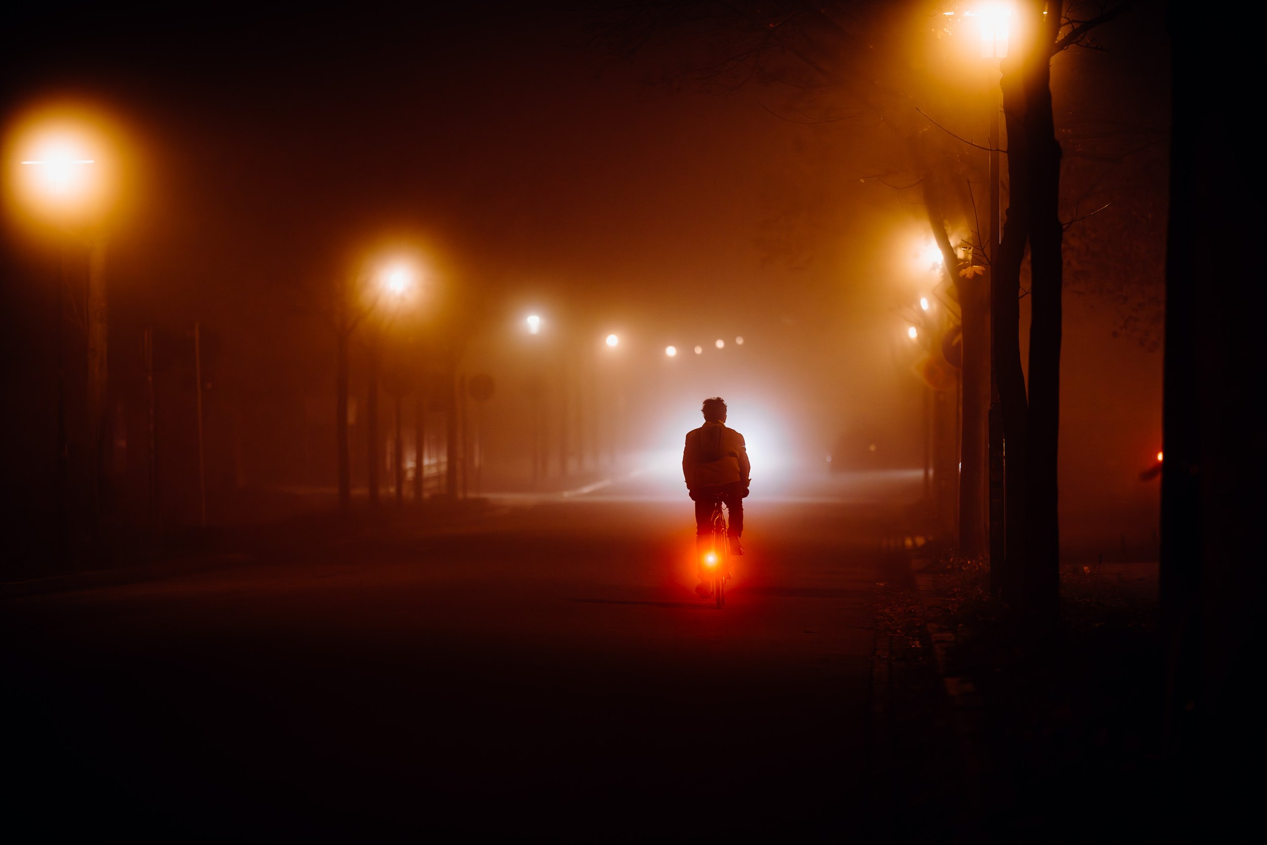 Die Autoscheinwerfer werfen lange, geisterhafte Schatten auf die leeren Straßen, die in der feuchten Luft fast greifbar erscheinen. Diese Schatten ziehen mich besonders an. Sie schaffen eine ganz eigene Szenerie: ein Spiel von Dunkelheit und Licht, von Schärfe und Unschärfe, das nur durch die Beschaffenheit des Nebels möglich wird. Die Stadt wirkt dadurch surreal – fast als ob man sie durch den Schleier eines Traums betrachten würde. Personen, die durch die Nacht eilen, wirken durch die Vergrößerung der langen Brennweite wie in einer eigenen, kleinen Welt gefangen. Ihre Silhouetten scheinen beinahe geisterhaft und schemenhaft