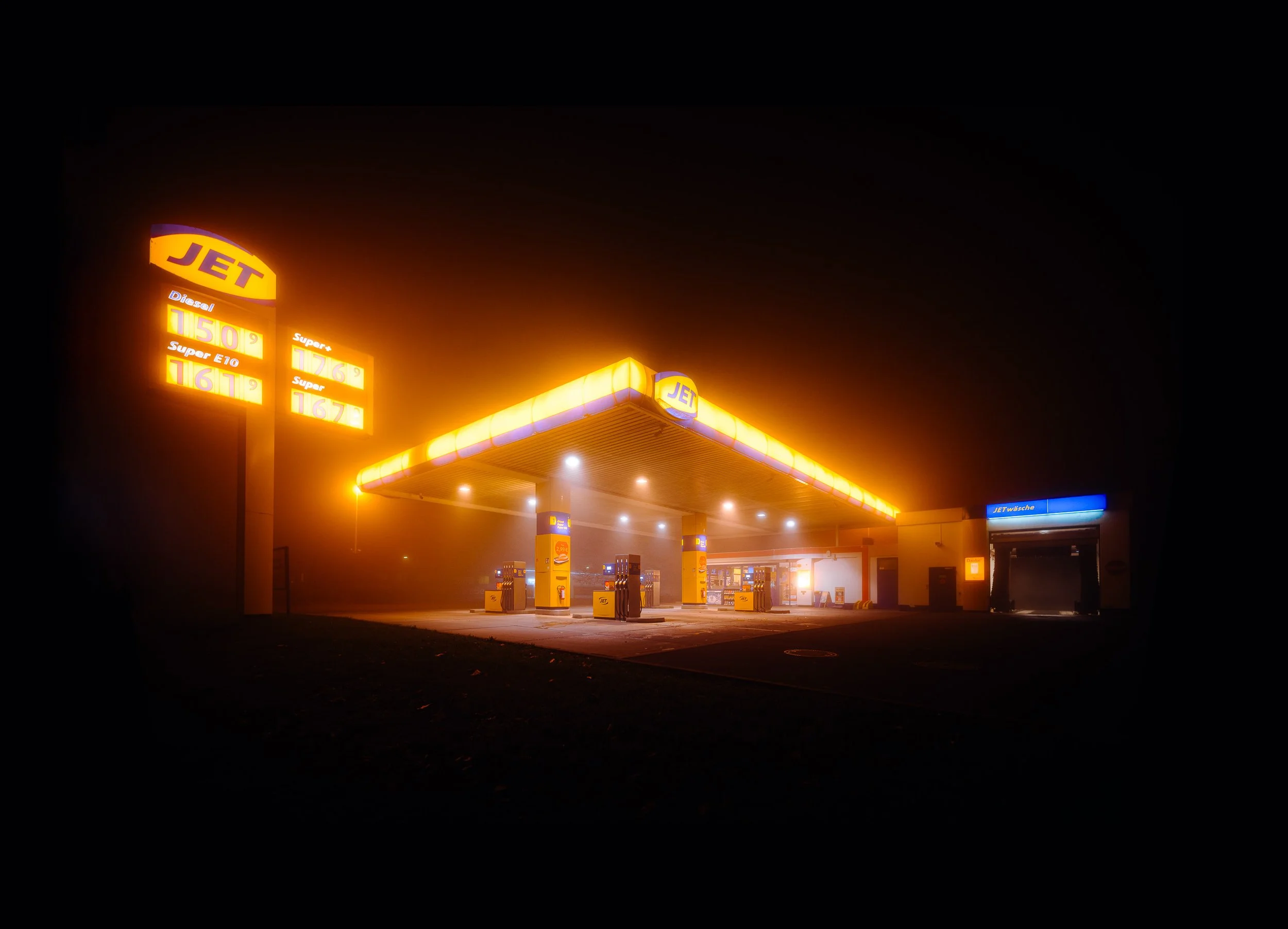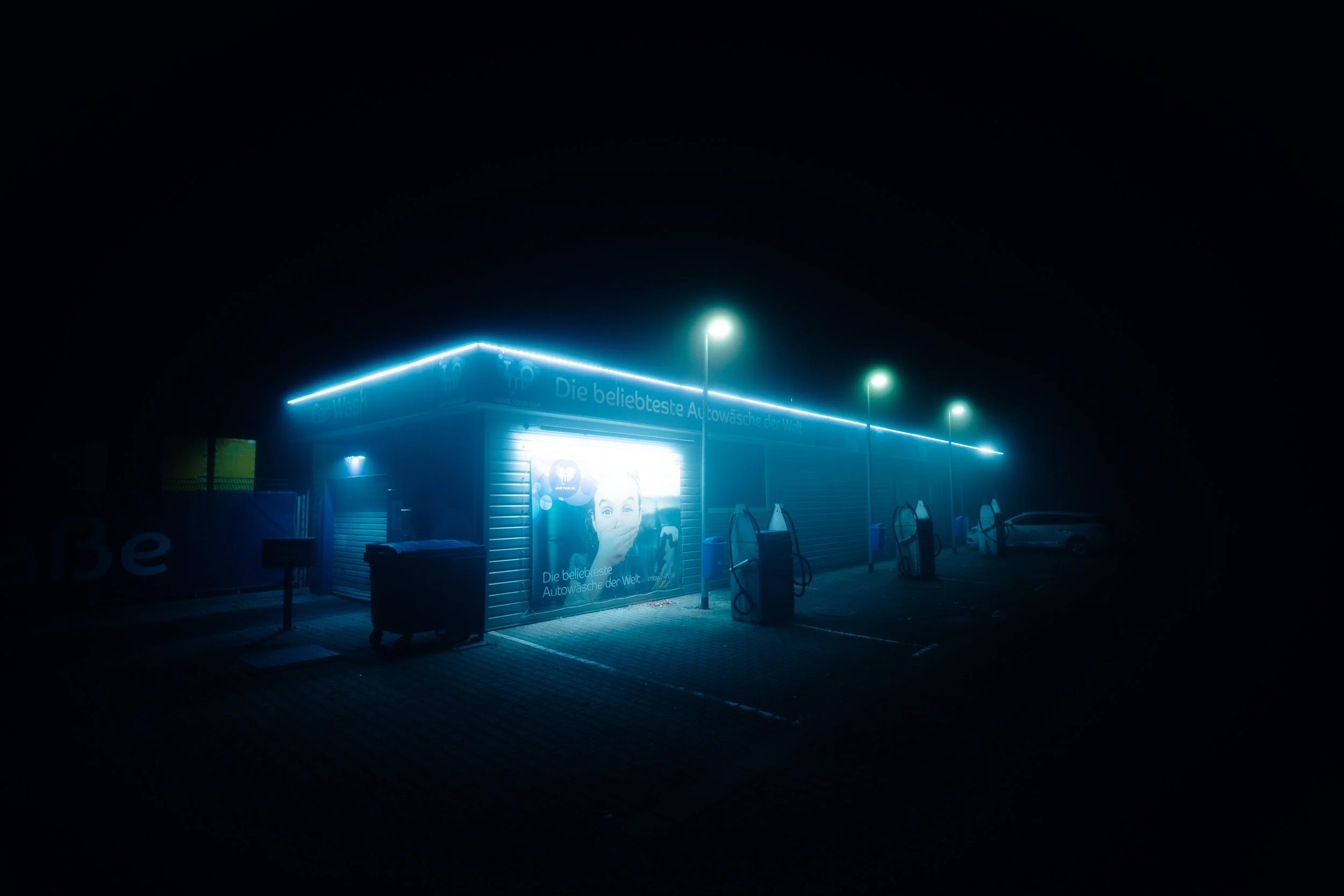 Doch die Nacht fordert nicht nur das Konzentrierte, das Enge – sie lädt auch zum Weiten, zum Offenbaren ein. Für breitere, atmosphärische Aufnahmen greife ich zu meinem 16mm-Weitwinkel. Besonders faszinierend ist das Licht der vorbeifahrenden Autos. Ihre Scheinwerfer durchbrechen den Nebel in einem kraftvollen Strahl, der die Dunkelheit durchricht. Diese Lichtspuren, eingefangen durch die Langzeitbelichtung, verleihen den Aufnahmen eine gewisse Dramatik. Das Kühle des Nebels, das warme Licht der Scheinwerfer, das statische Glimmen der Straßenlampen und die Bewegung der Autos, die die Stadt durchziehen. Es ist ein Zusammenspiel, das nur in dieser nächtlichen Nebelkulisse möglich ist und in dem jede einzelne Lichtquelle eine eigene Rolle spielt.