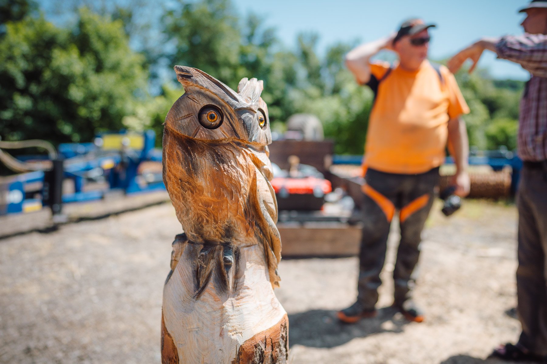 Ein paar Schritte weiter standen Holzspäne in der Luft, begleitet vom rhythmischen Kreischen einer Kettensäge. Ein Mann, konzentriert und ruhig, arbeitete an einem massiven Holzstamm. Doch was er da formte, war kein rustikaler Gartenstuhl, es war eine Eule. Mit Kettensäge, Winkelschleifer und einem unglaublichen Gespür für Form und Proportionen ließ er aus dem groben Stamm nach und nach ein Tier entstehen. Seine Fingerfertigkeit war beeindruckend: kontrolliert, präzise, trotz der rohen Werkzeuge. Und während um ihn herum das Hoffest pulsierte, schien für einen Moment alles still zu stehen, als würde das Holz selbst zuhören, was aus ihm werden soll.