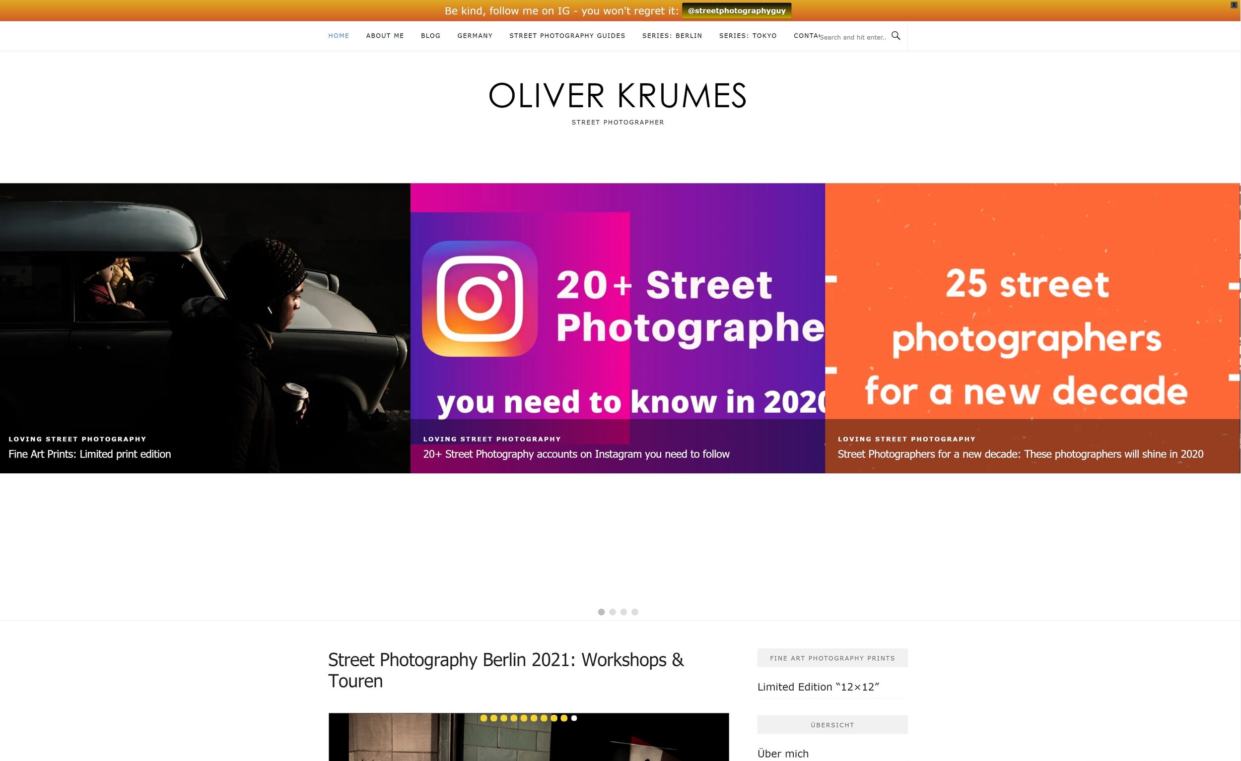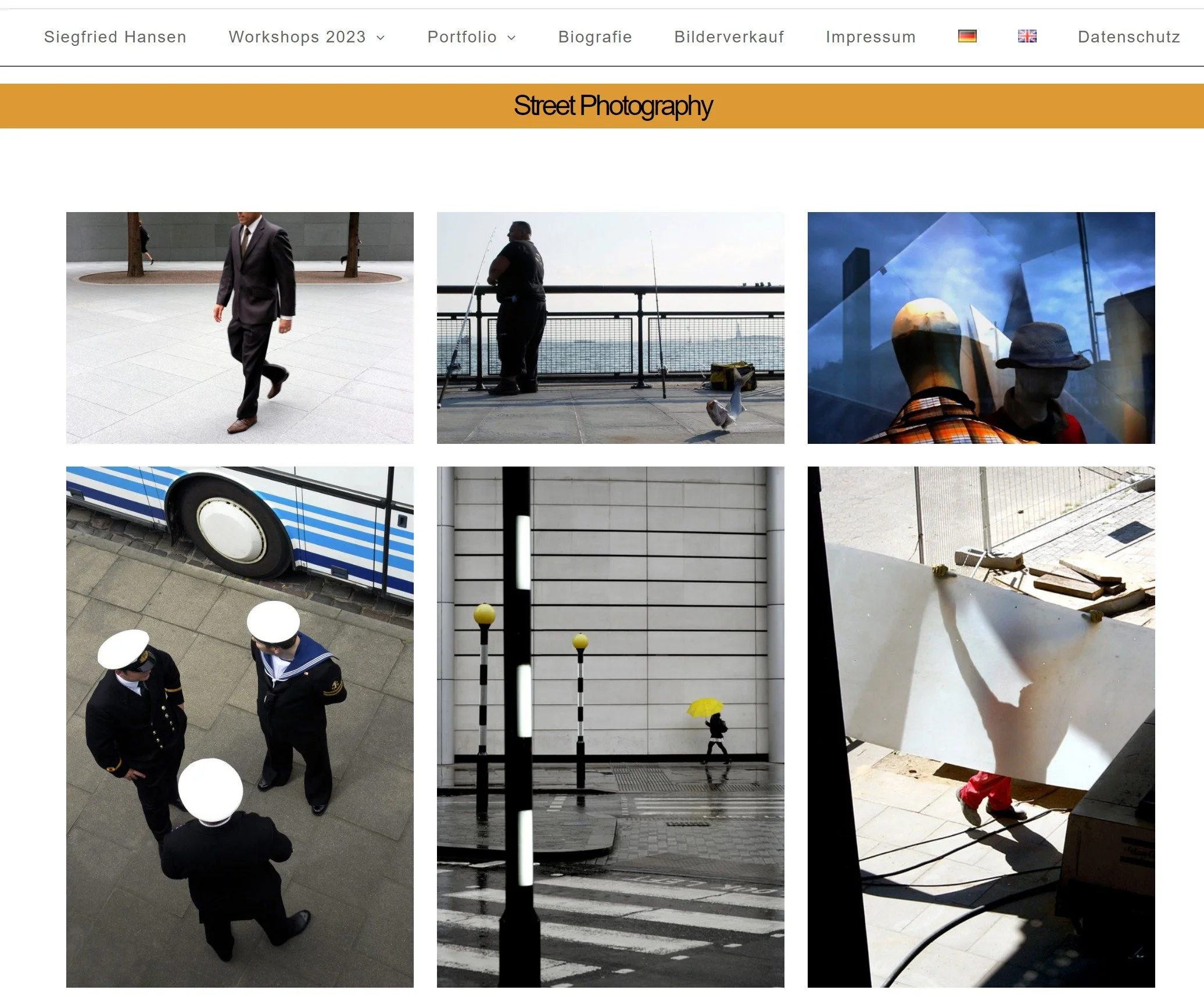 Allumfassende Sammlung zum Thema Straßenfotografie in Deutschland. Mit CitiyGuides von Städten wie Hamburg, München oder Berlin. Auch Tipps zu interessanten Ausstellungen, Museen oder Büchern zum Thema wird man hier bei einem Besuch der Webseite finden. Einen Workshop bietet der leidenschaftliche Straßenfotograf ebenso an, wie ein personal Coaching via Zoom und co.